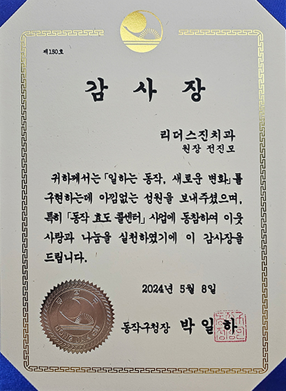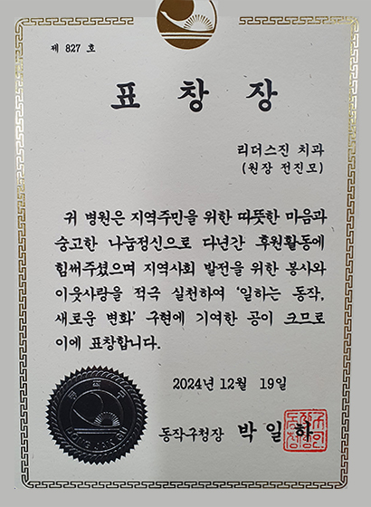 단순한 상장이 아닌, 그동안 묵묵히 실천해온 따뜻한 의료 철학의 증표라고 생각합니다.